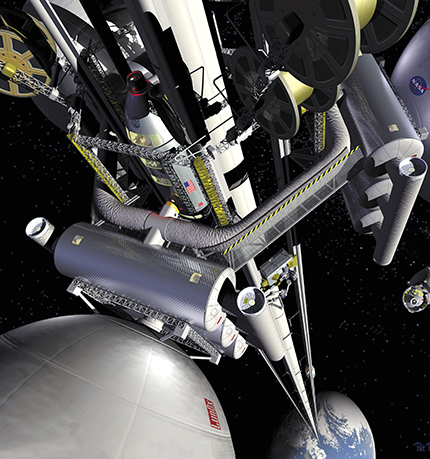 Figure 1. The space elevator, supported against gravity by centrifugal force, could forge a versatile link between the surface of Earth and the reaches of outer space. To realize the concept, we will need to manufacture new, strong materials, almost certainly designed with the help of computers. (Rendition by Pat Rawlings, courtesy of NASA.)