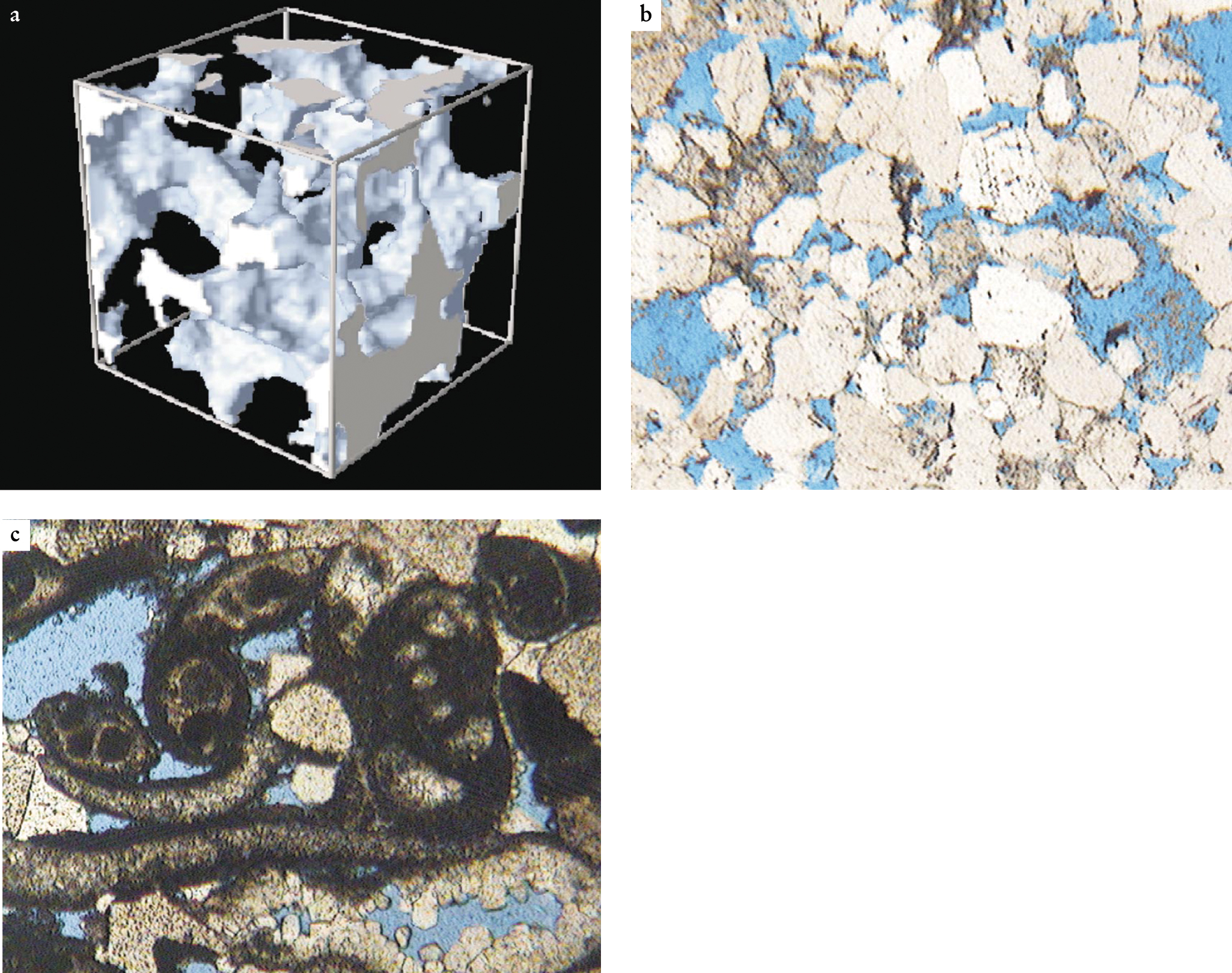Reservoir rocks have a complicated distribution of grain and pore sizes. (a) An x-ray microtomograph of a piece of sandstone gives a three-dimensional image of its pore space. The edge length of the illustrated cube is 480 µm. (Adapted from ref. 6.) (b) This photograph of a two-dimensional slice of Berea sandstone with a porosity of about 0.2 shows the sandstone’s quartz grains, large and small pores, and small connecting throats. (The pores and throats are blue.) A typical petroleum-bearing rock will have water coating the grains, with oil in the larger pores. Oil extracted from the rock must pass through the small throats. (c) This photograph of a 2D slice of Indiana limestone with a porosity of about 0.2 shows pores (blue), crystals (tan) and fossils (darker areas outlined in black) yielding a complex microgeometry. The slices shown here and in (b) are both 1100 µm × 1470 µm.