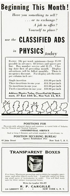 Ads depict not only the instrumentation and technology trends but also the job market and the field’s demographics. As the Cold War and space race heated up, for example, ads for the defense and aerospace industries burgeoned. The January 1968 issue, flush with ads, ran 192 pages long. For the first several decades, most recruitment ads assumed that candidates were male and almost all the scientists depicted in them were white. As part of Physics Today’s 70th anniversary commemoration, former senior editor Melinda Baldwin surveyed the ups and downs of the physics job market as told through the magazine’s display and classified ads (see “Physics Today ads track employment boom and bust,” Physics Today online, 7 May 2018).