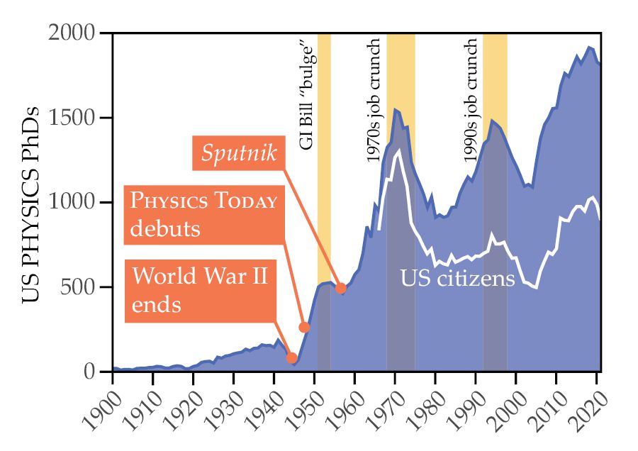 Growth in the physics community, as measured by the number of physics PhDs conferred annually in the US. (Courtesy of the AIP Statistical Research Center, including data from the American Council on Education [1900–19] and National Academy of Sciences [1920–61].)