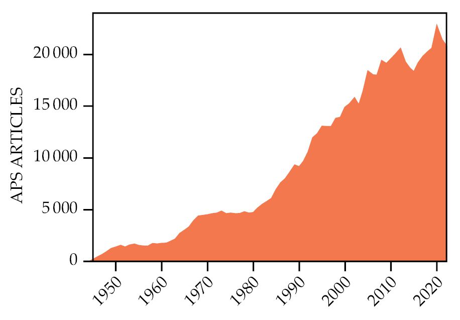 Growth in publications, as reflected in the annual number of journal articles published by the American Physical Society. (Data courtesy of Crossref.)
