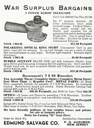 Articles, news stories, and other editorial material aren’t the only content that informs readers about what’s going on in the community. So, too, do the advertisements. Ads from book publishers proliferated in the first decade and have been around ever since. The earliest issues also featured ads for surplus military optics from Edmund Salvage Corp (later Edmund Scientific) and for US savings bonds.