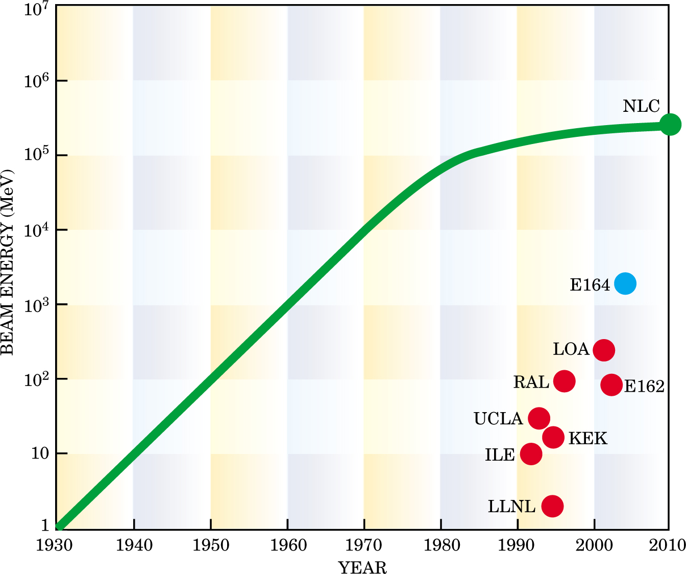 Figure 1. Exponential growth of accelerator beam energy, traditionally depicted by the Livingston curve (green), began tapering off around 1980 as conventional radio-frequency technology approached its limits. The extrapolation to 2010 ends with the 250-GeV electron and positron beams of the 30-km-long Next Linear Collider (NLC), which particle physicists are proposing to build with state-of-the-art RF technology. Progress toward a more radical solution that might eventually reach the high-energy frontier with much shorter linear accelerators is indicated by the red dots, which mark energies already obtained in some of the plasma-acceleration experiments in the US, Japan, and Europe. (Institutional abbreviations are spelled out in the text.) They all represent electron acceleration, except for E162 at SLAC, which is for positrons. The blue dot marks the record electron energy anticipated from a plasma experiment now in progress.