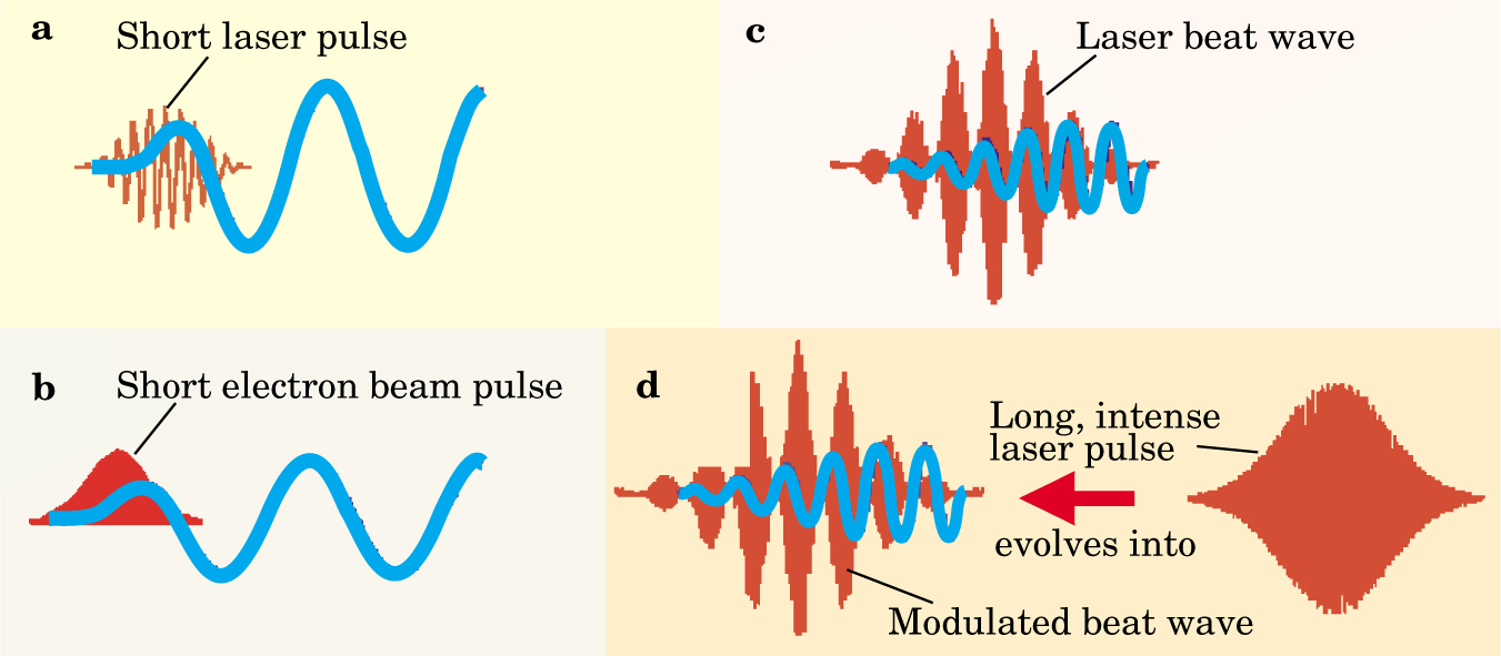 Figure 2. Four different kinds of driver pulses (red, propagating from right to left) that can excite a relativistic electron density wave (blue) in a plasma accelerator. (a) In a laser wakefield accelerator, the radiation pressure of a short, intense laser pulse pushes plasma electrons away to initiate the accelerating plasma wakefield. (b) In a plasma wakefield accelerator, the plasma electrons are pushed away by the Coulomb force of a short, high-charge relativistic bunch of electrons from a linac. (c) In a laser-driven plasma beat-wave accelerator, the interference between two high-frequency lasers produces a laser beat wave whose frequency equals the plasma’s natural oscillation frequency. (d) In a self-modulated laser wakefield accelerator, a long, intense laser pulse interacting with the plasma acquires a beat-wave-like amplitude modulation by the Raman forward-scattering instability.