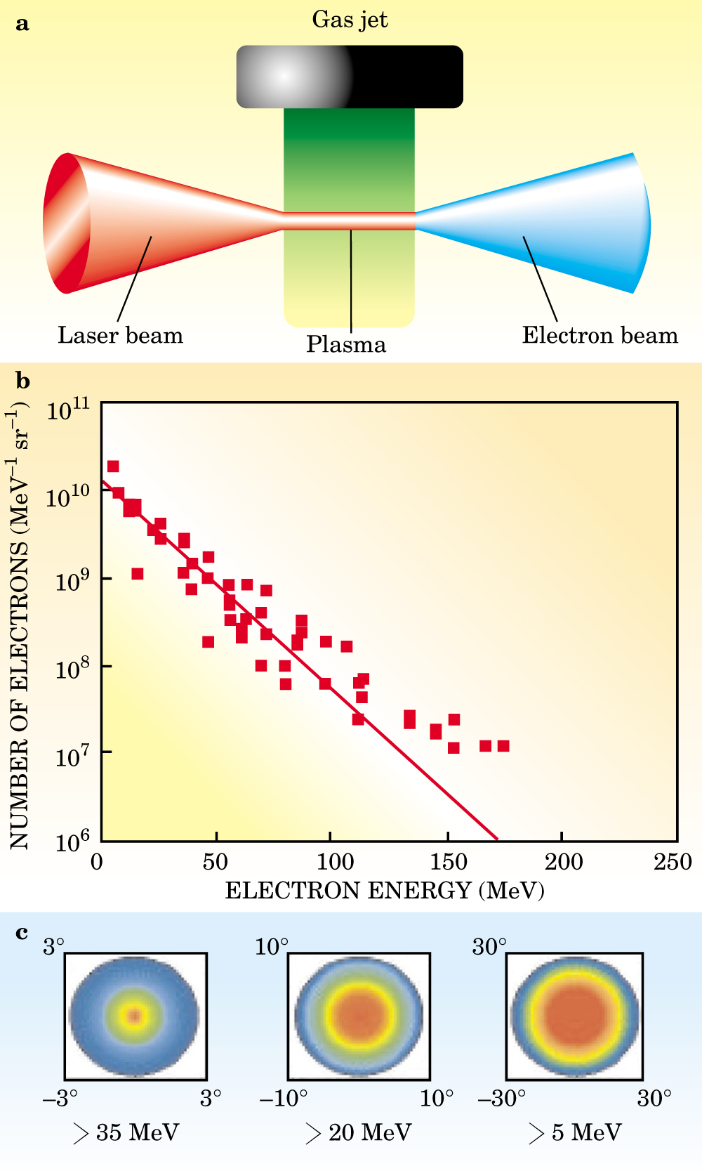 Figure 3. Tabletop laser wakefield acceleration of electrons to a few hundred MeV. (a) A typical tabletop setup would fire focused ultrashort laser pulses into a laminar-flow gas jet to produce a plasma and excite a wakefield. The wakefield traps plasma electrons and accelerates them to about 100 MeV in just a millimeter. (b) Recent results with 50-fs, 100-TW laser pulses at the Laboratoire d’Optique Appliquée (LOA) in France demonstrate acceleration of electrons to 200 MeV in 1 mm of plasma.11 (c) The angular distribution of the electrons in the LOA experiment, for three energy ranges, shows that the spread of exit angles, and therefore the emittance of the accelerated beam, decreases with increasing electron energy. For each energy range, the blue outer circle indicates the full width at half maximum of the angular distribution for that range.