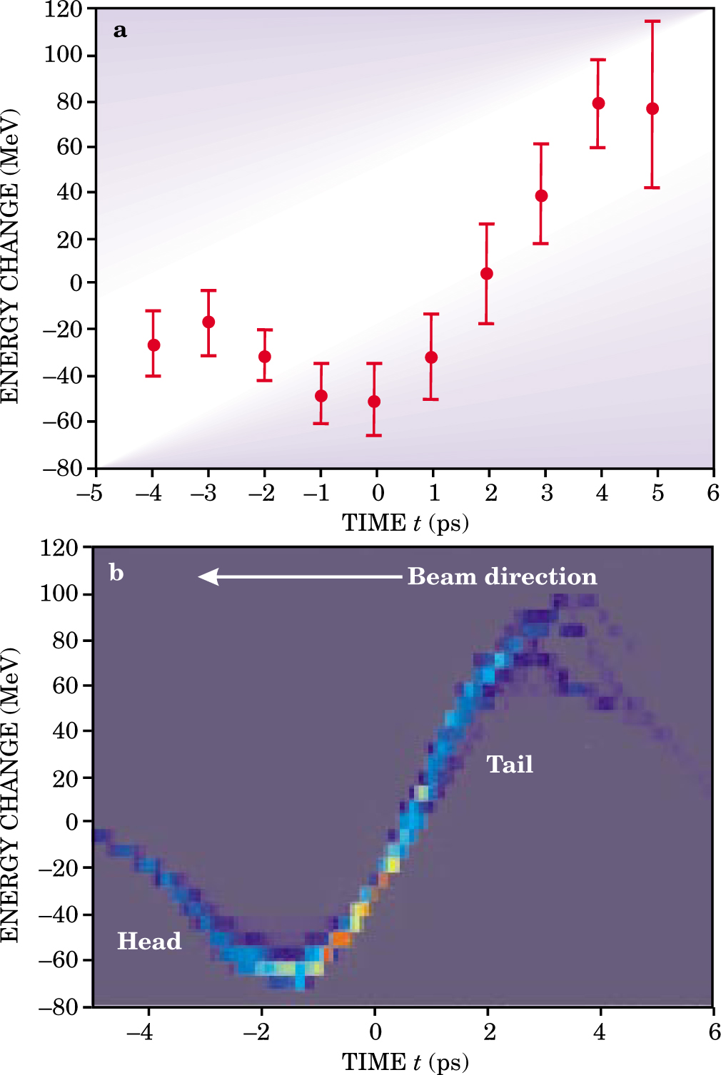 Figure 4. Observation and simulation of positron energy changes resulting from traversal of a 1.4-m-long plasma. (a) In a plasma wakefield experiment at SLAC,15 energy changes were recorded for different temporal slices of the 10-ps relativistic positron beam pulse. Whereas the bulk of the pulse (near t = 0) showed energy loss of about 55 MeV, its tail (t later than +1 ps) demonstrated energy gain of as much as 80 MeV. This was the first demonstration of high-gradient plasma acceleration of positrons. (b) A computer simulation of the SLAC experiment group predicted much the same pattern of deceleration of the pulse’s head followed by acceleration of its tail.