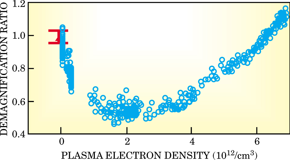 Figure 5. Plasma focusing of a 30-GeV positron beam from the Stanford Linear Accelerator. At a fixed distance beyond the plasma lens, the demagnification of the beam diameter, which was initially 50 µm, is plotted against the electron density of the focusing plasma. As the plasma density is increased toward its optimum (2 × 1012/cm3), the focusing strength increases and the beam diameter is pinched to half its initial value. But at still higher plasma densities, the beam is overfocused and the spot size grows again. The red error bar indicates the diameter uncertainty of the beam without plasma focusing.
