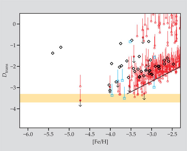 Figure 1. Stars that have survived to the current day were born from gas that could cool enough to form low-mass stars. According to one model,7 that environment had to contain enough carbon and oxygen that a function of the two, called the transition discriminant Dtrans, lies above the critical value of −3.5. The x-axis label [Fe/H] denotes the log of the iron-to-hydrogen abundance, normalized to solar values. The shaded swath is centered at the critical value of Dtrans; its width represents theoretical uncertainty. The diagonal black line gives Dtrans obtained with the solar abundance ratio of Fe to C to O. Data points are for metal-poor stars in the halo of the Milky Way (black and red) and for dwarf galaxies accompanying the Milky Way (blue). Vertical lines and arrows indicate a possible range of Dtrans for those cases in which we have incomplete knowledge of the C and O abundances. Most, but not all, stars lie comfortably above the critical threshold. (Adapted from ref. 9.)