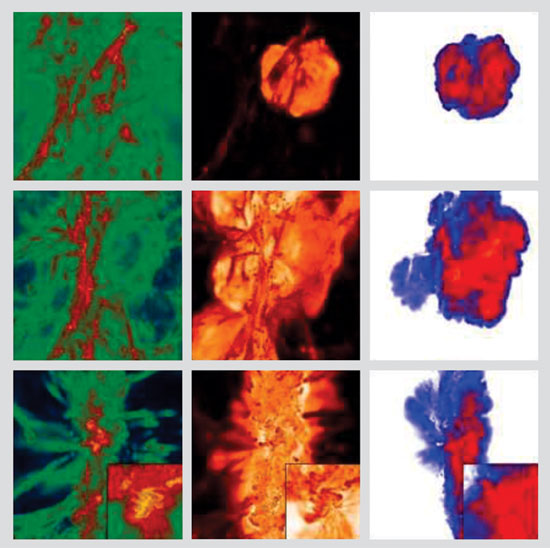 Figure 2. A supernova explosion of a Population III star distributes matter into the intergalactic medium; eventually that matter re-collects at the center of a primordial galaxy. This supercomputer simulation shows, from left to right, gas density (green low, orange high), temperature (dark low, bright high), and metallicity (blue low, red high). Panels from top to bottom are for times 15 million, 100 million, and 300 million years after the explosion. The inset panels in the bottom row zoom into the center of the emerging first galaxy. The high-metallicity environment there is conducive to the formation of Population II stars. (Adapted from ref. 13, T. H. Greif et al.)
