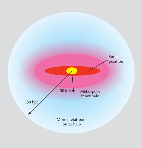 Figure 3. A galactic halo surrounds most of the luminous matter of the Milky Way. This schematic view of the galaxy shows the galactic bulge (yellow), the galactic disk (red), the inner halo (pink), and the outer halo (light blue). A distance of 1 kiloparsec (kpc) corresponds to 3260 light-years. The inner parts of the galaxy are not to scale. In particular, the Sun is about 8 kpc from the galactic center.