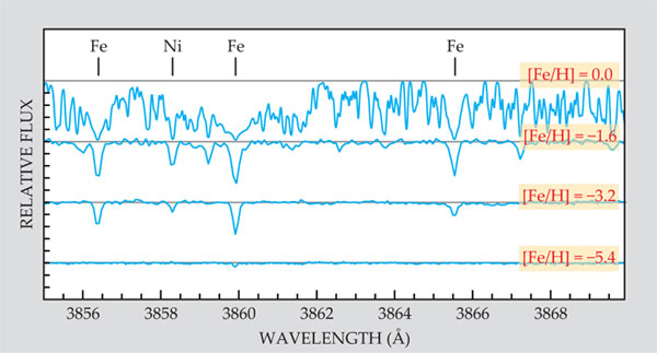 Figure 4. HE 1327–2326, the most iron-poor star yet discovered (as measured by the logarithmic abundance ratio [Fe/H]), has just a tiny absorption-line bump visible in the lowest of the four absorption spectra shown here. The stars generating the other three spectra are, from top to bottom, the Sun, G66–30, and G64–12. Evidently, the variations in line strength reflect the decrease in stellar metallicities. Four neutral elemental absorption lines are indicated near the top of the plot. (Adapted from ref. 18.)