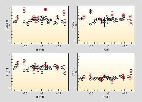 Among the elements found in every metal-poor star are α elements like magnesium-24 and calcium-40 that are multiples of the helium-4 α particle. Determining α-element abundances enables astrophysicists to establish a rough chemical-enrichment time scale for the system that hosted the metal-poor stars. At early times, type II supernovae, which manifest the core collapse of massive stars, established a characteristic [α/Fe] ratio. After about 1 billion years, the first lower-mass stars in a system began to explode as type Ia supernovae—white dwarf stars that accreted too much mass from a companion in a binary system—and added fresh Fe to the interstellar medium. As a consequence, [α/Fe] should be lower in late generations of stars. Such a decrease has been observed in halo stars at higher metallicities of [Fe/H] > −1.5 and in dwarf galaxies, and it indicates that not all systems have the same enrichment time scale.