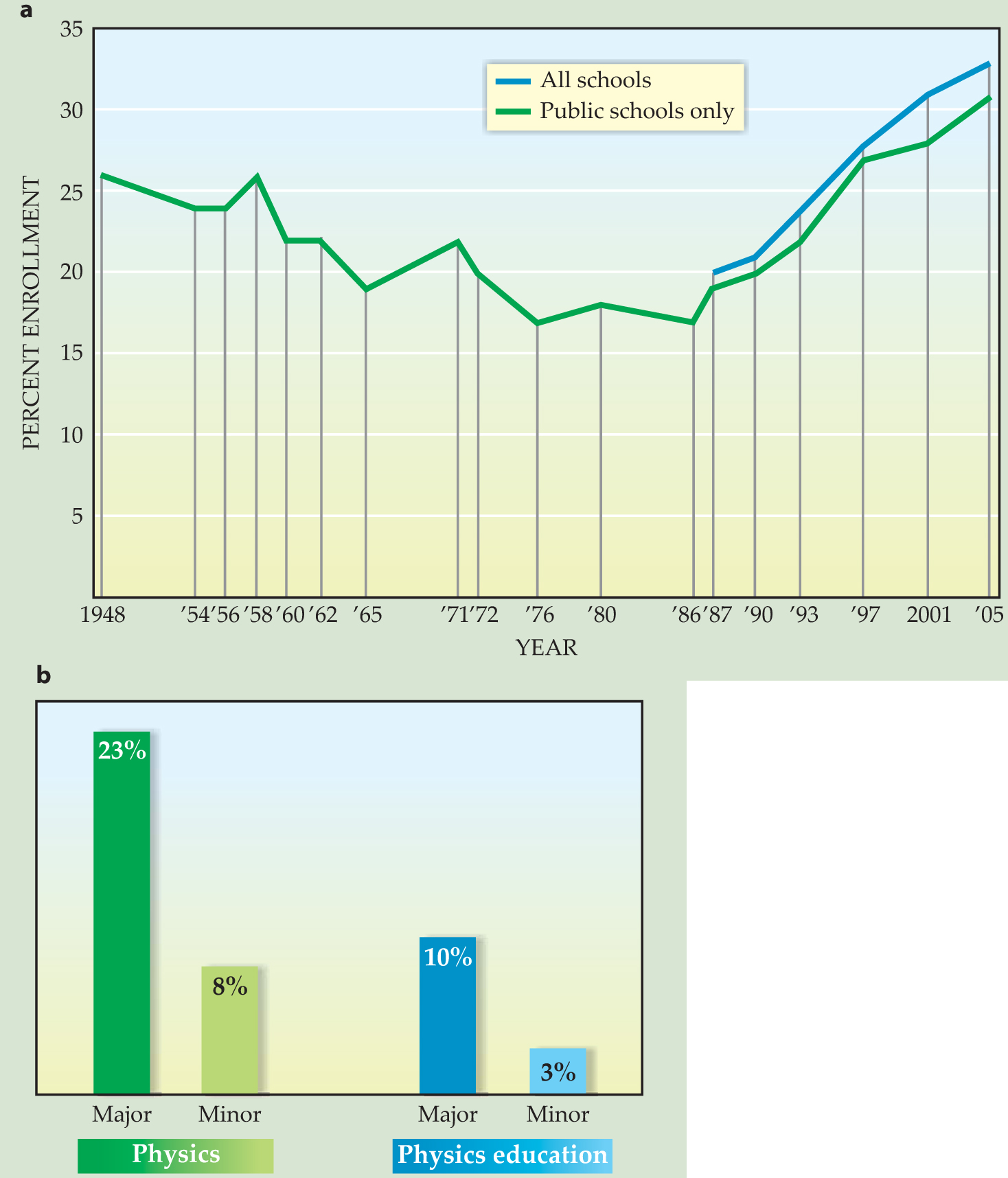 Figure 1. Snapshots of high-school physics . (a) High-school physics enrollment has risen dramatically over the past two decades. The graph shows the percentage of high-school seniors who had taken physics or who were taking it in the indicated years. (b) In the 2004–05 academic year, some 33% of physics teachers had a major in physics or physics education and another 11% had a minor. In fact, the preparation of teachers has remained about the same for at least a decade.