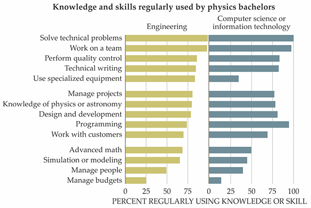 When polled about what kinds of knowledge and skills they rely on daily, weekly, or monthly, physics graduates from 2013 and 2014 now working at private-sector jobs in engineering or computer science cited the broad range listed here. Graduates in both fields ranked several technical and professional skills as more useful—or more precisely, used more regularly—than a knowledge of physics. (Adapted from ref. 4.)