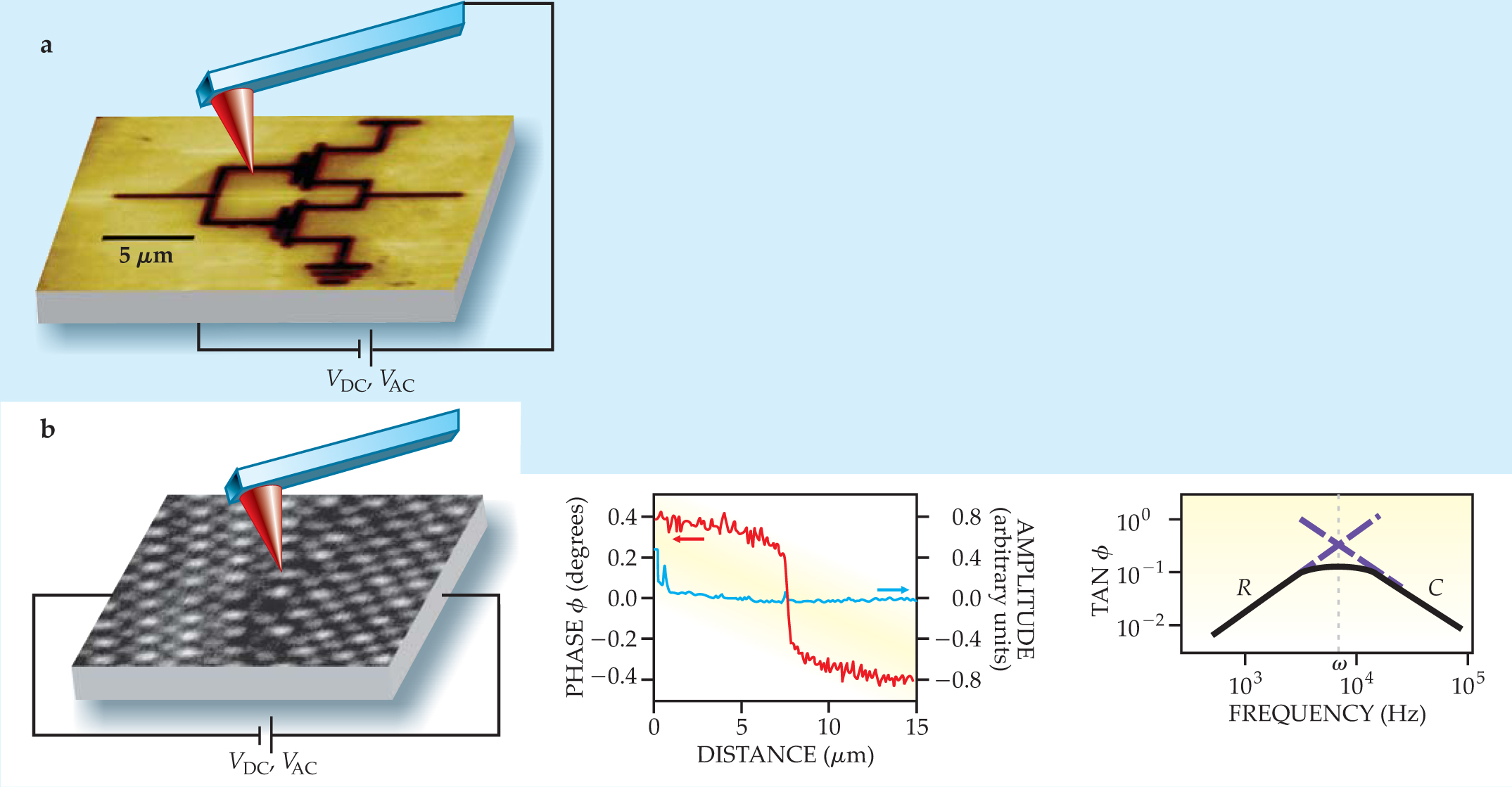 The simple combination of a tip, a surface, and the interaction between them has yielded powerful insights into the spatial distribution of simple material properties, even when the microscope is configured to just map the variations in electromagnetic fields that the tip feels as it scans a surface. But what makes SPM so powerful is the dozens of ways in which the interaction can be tailored—by somehow perturbing the tip or the sample—to investigate additional behaviors of the system. Periodic electrical, magnetic, or mechanical signals can be induced on the tip, for instance, and the frequency dependence or harmonics of the response function can be measured (see figure 1). An alternative to biasing the tip is to apply a lateral field across a surface feature or device component—an approach that facilitates electron-transport measurements.
