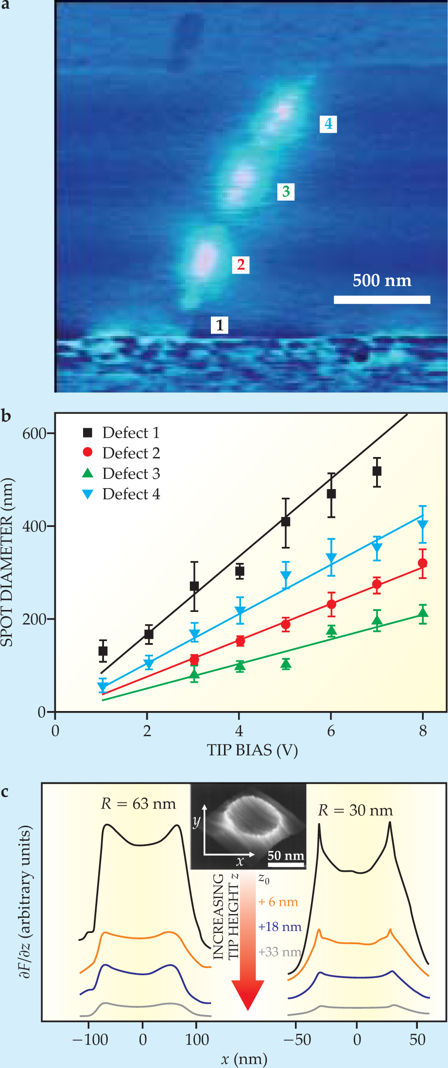 Figure 4. Properties of nanotubes and nanowires. (a) This scanning impedance micrograph reveals current flowing though a carbon nanotube containing four defects. The tip is held at 4 V. (b) The apparent size of each defect increases linearly with the bias voltage applied to the tip. The slope of each line determines the local valence-band energy due to the corresponding defect. (Adapted from ref.