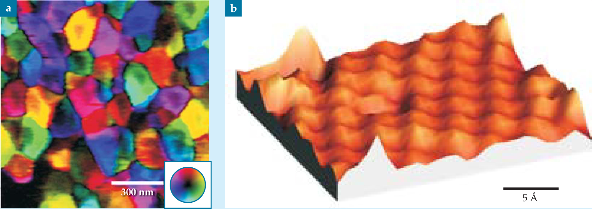 Figure 5. This piezoresponse force microscopy image (a) reveals barium titanate’s response to an applied electric field. The colors represent the magnitude and direction of surface displacement in two dimensions for individual domains. Black represents zero response and colors indicate lateral and vertical displacement according to the wheel in the lower right-hand corner. (Adapted from ref.