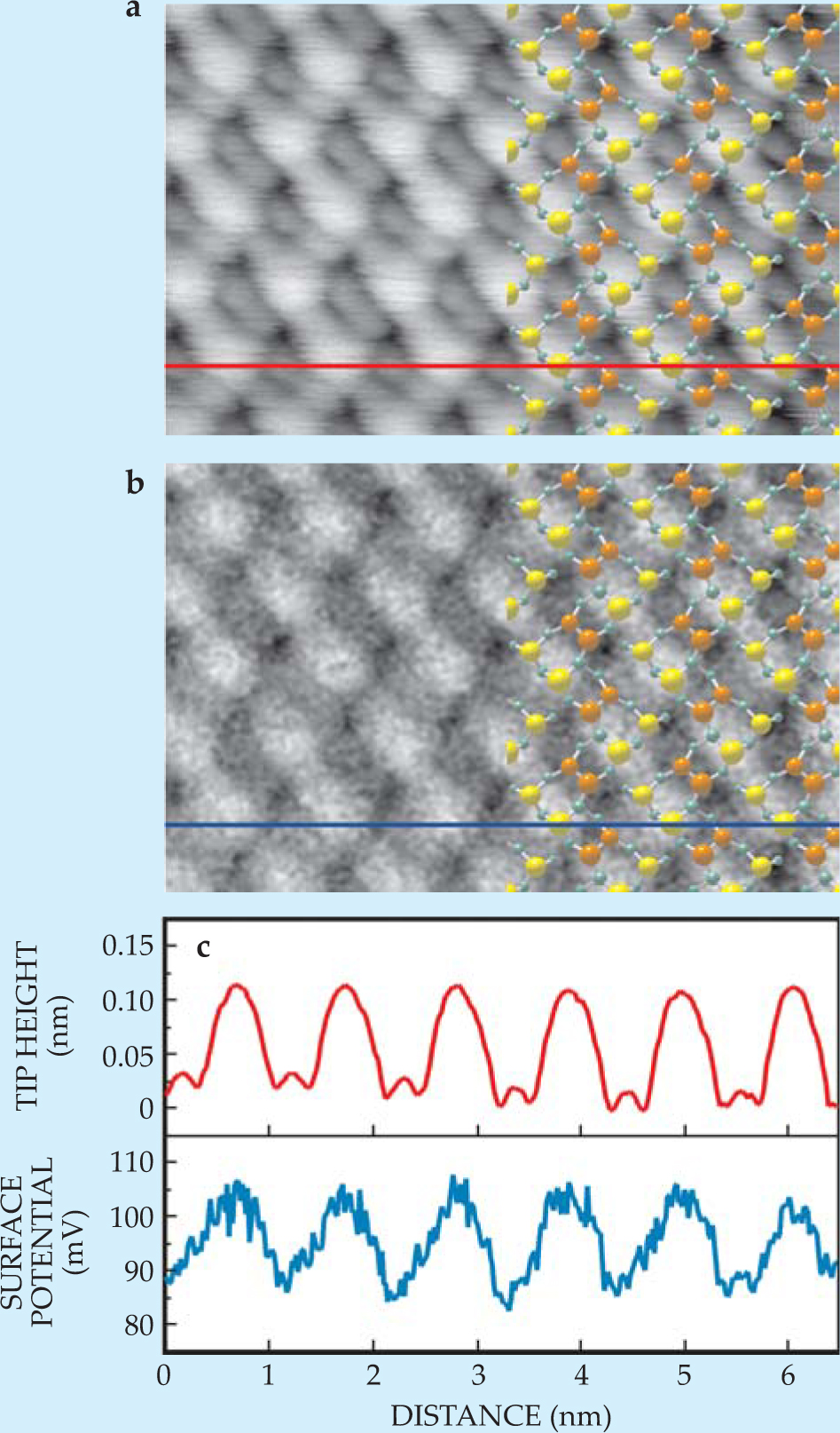 Figure 6. Noncontact atomic force microscopy resolves the (1 × 2) atomic reconstruction (a) of a germanium surface. Simultaneously, the microscope’s tip measures variations in the surface potential (b) during the scan. Yellow atoms are ones that rebonded during the reconstruction; orange atoms have dangling bonds and consequently a lower work function. (c) The topography (red) and potential (blue) along the same section of the surface.