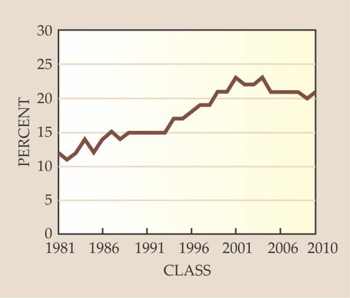 The graph illustrates a classic good news–bad news situation. The good news is that over the last several decades the physics community has been doing something right: The percentage has increased from about 12% in 1981 to 21% in 2010, though a plateau started around 2003. The bad news, of course, is that large improvement started from a small base, and for every woman receiving a bachelor’s degree in physics there are still four men. Since a bachelor’s is the entry into graduate school and a high-level career in the field, most of the problems with the underrepresentation of women in senior positions can be traced back to that statistic. Thus if we are to begin to approach the problem, we must begin by examining the status of women in undergraduate programs.
