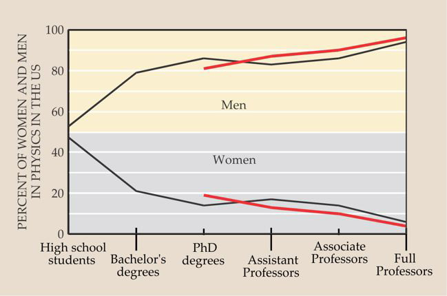 Figure 2. The breakdown by gender of various stages of the US education pipeline in physics in 2005 and 2006. The black lines are actual data; the red are expectations based on the available pools of women physicists in the past. The biggest drop for women happens between high school and college graduation. (Adapted from ref. 2; updated data courtesy of Rachel Ivie.)