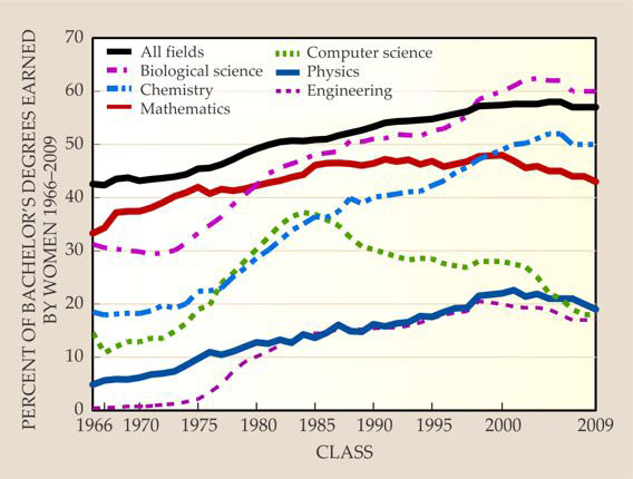 Some useful data for our discussion are presented in figure 3, which shows the percentage of bachelor’s degrees awarded to women in various fields of science; the highest number of degrees earned are in chemistry, mathematics, and the biological sciences, with physics and engineering having the least.