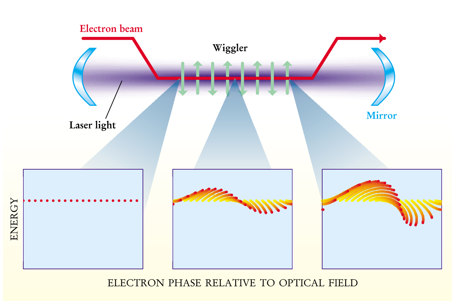 Figure 1. A Free-electron laser oscillator uses a beam of relativistic electrons passing through the periodic field (green arrows) of an array of wiggler magnets in the presence of a copropagating laser light beam stored between the mirrors of a resonator. The bottom panels, each having the width of one optical wavelength, show the phase-space evolution of bunching in the electron beam as it traverses the wiggler. The vertical axis designates the electron energy and the horizontal axis gives the phase of the copropagating light at the electron’s position. A beam electron sees one optical wavelength passing over it as it traverses each wiggler period. The brown end of the evolving phase-space path gives the electron’s status at that point. The beam bunches up, and thus begins radiating coherently with the laser light, as electrons continue to gain or lose energy, depending on the optical phase.