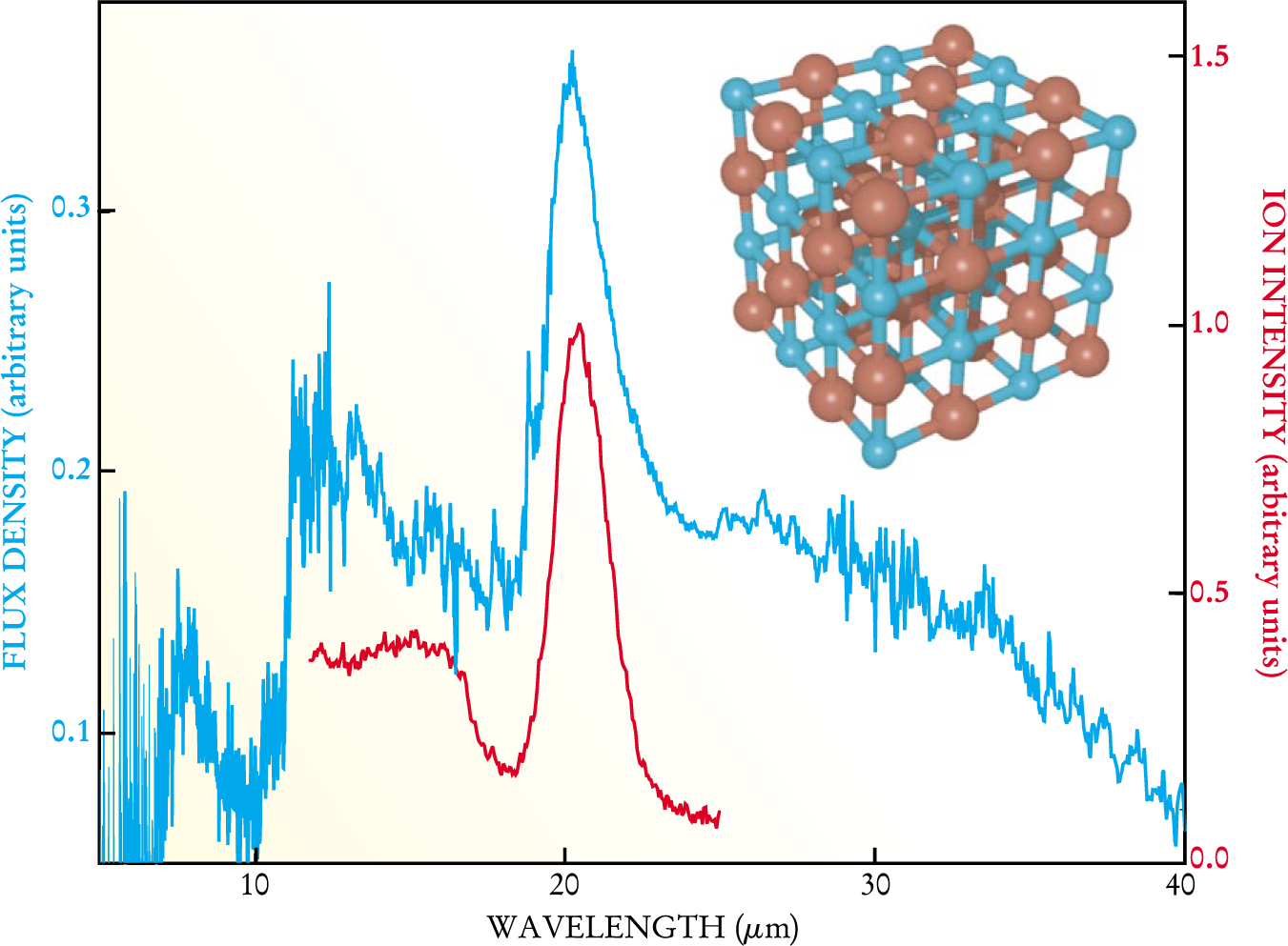 Figure 3. Astrophysical mystery of the prominent 21 μm peak in the emission spectra of certain giant stars was solved by comparing them with the spectrum of TiC nanocrystal clusters (red trace) produced by the free-electron laser at the FELIX facility in the Netherlands. The ultraviolet spectrum of the star SAO 96709 (blue trace) was recorded by the Infrared Space Observatory. The comparison makes the case that TiC nanocrystals are present in the outflows of such stars. The lattice is a pictorial representation of a typical 64-atom TiC nanocrystal.