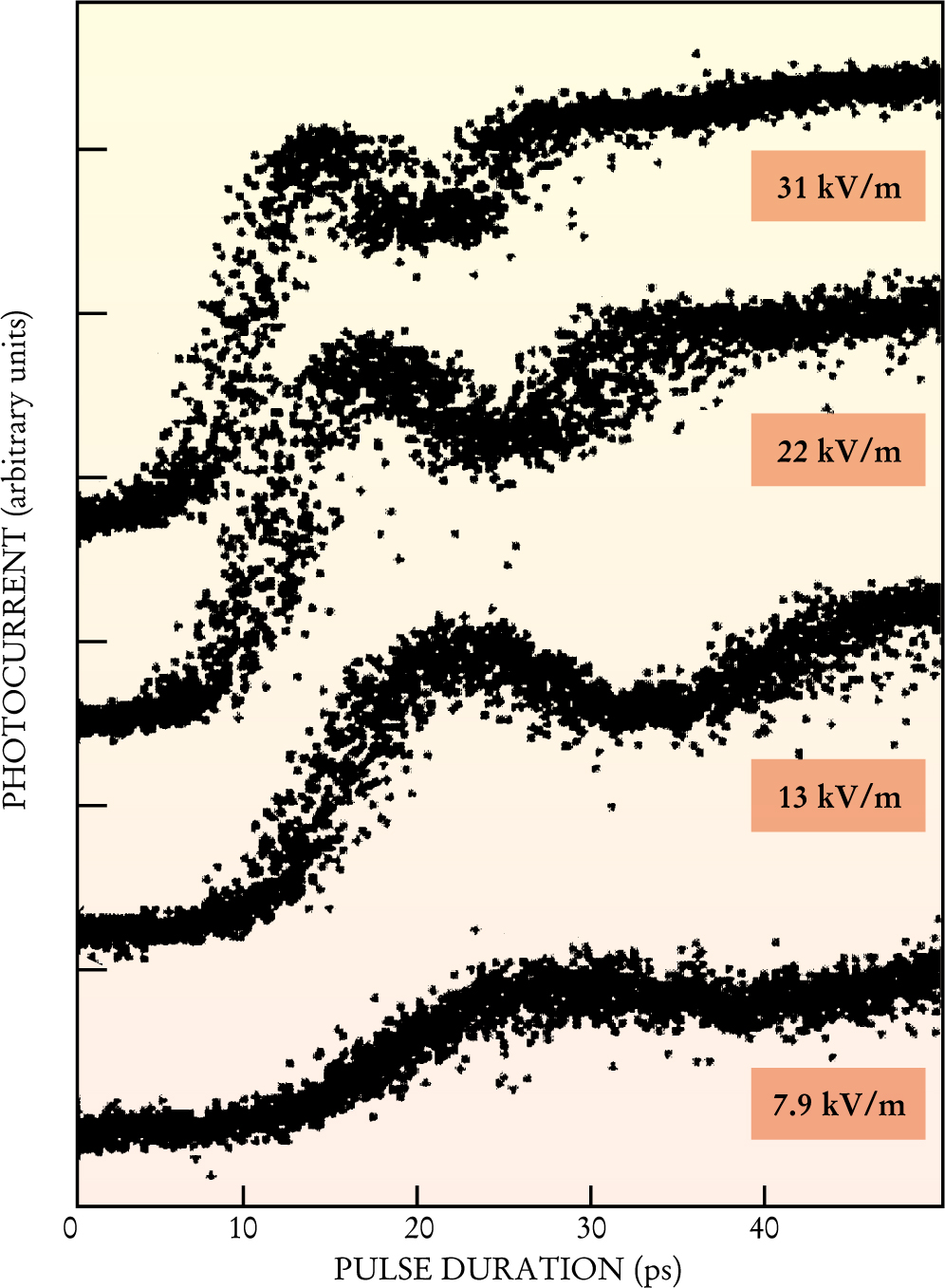 Figure 4. Rabi oscillation of electrons bound to shallow hydrogenic impurities in a GaAs crystal has been demonstrated with a free electron laser. Intense terahertz FEL irradiation promotes bound ground-state electrons to an excited state from which they can escape to the crystal’s conduction band. The transition radiation induces Rabi oscillation between the two states. Where the electrons end up depends on the duration of the irradiation pulse and the Rabi oscillation frequency, which is proportional to the amplitude of the THz irradiation. Plotting the crystal’s photoconductivity against pulse duration, for different irradiation intensities, exhibits damped Rabi oscillation.