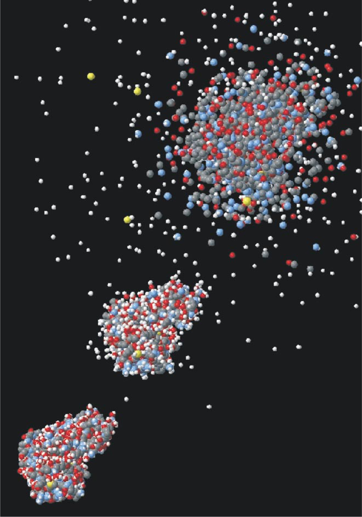 Figure 5. Simulated explosion of a single protein molecule (T4 lysozyme) by 12-keV x rays in a 50-femtosecond pulse of 3 × 1012 photons focused on a 100-nm spot. At lower left is the intact molecule before the pulse. In the middle, the pulse has ended but electrostatic repulsion has not had time to disperse the fragments, so that the diffraction pattern is not dominated by radiation damage. At upper right, we see the debris after another 50 fs.
