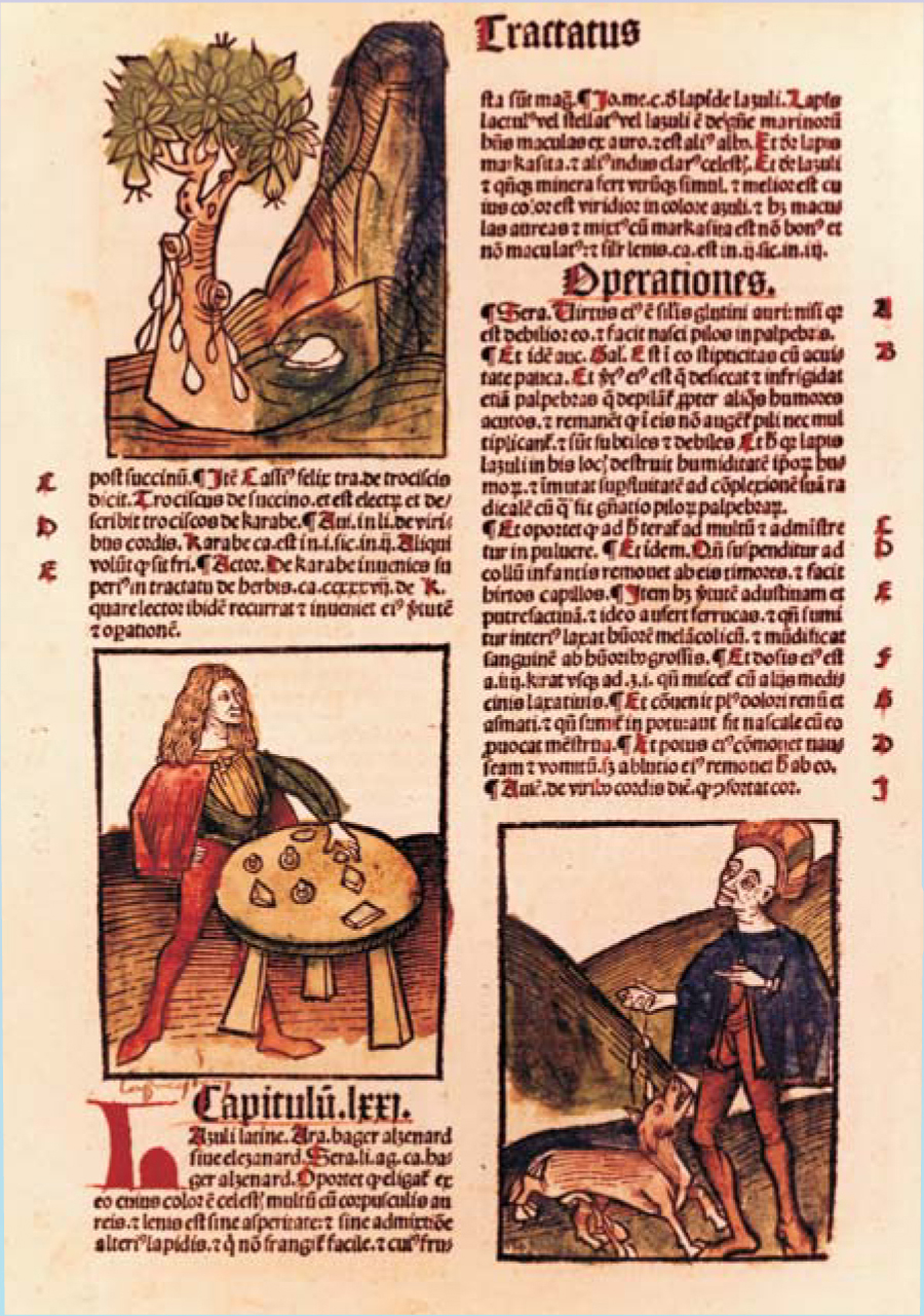 Figure 2. The mythological origin of pyroelectric crystals dates back to about 315 BC, when the Creek philosopher Theophrastus wrote his treatise “On stones,” about lyncurium (tourmaline, most likely) and other minerals. Just 14 pages long, that text was a valuable work on mineralogy for 18 centuries, The hand-colored woodcuts shown here illustrate Hortus Sanitatis Major (The Garden of Health), a book published in 1497 that describes medicinal and therapeutic values of plants, animals, and minerals in terms of superstitious views held in the late Middle Ages. The hardness of lyncurium contrasts with the softness of amber, whose formation is pictured in the top left. The sketch on the right depicts Theophrastus’s bizarre belief that pyroelectric lyncurium comes from the urine of a lynx.