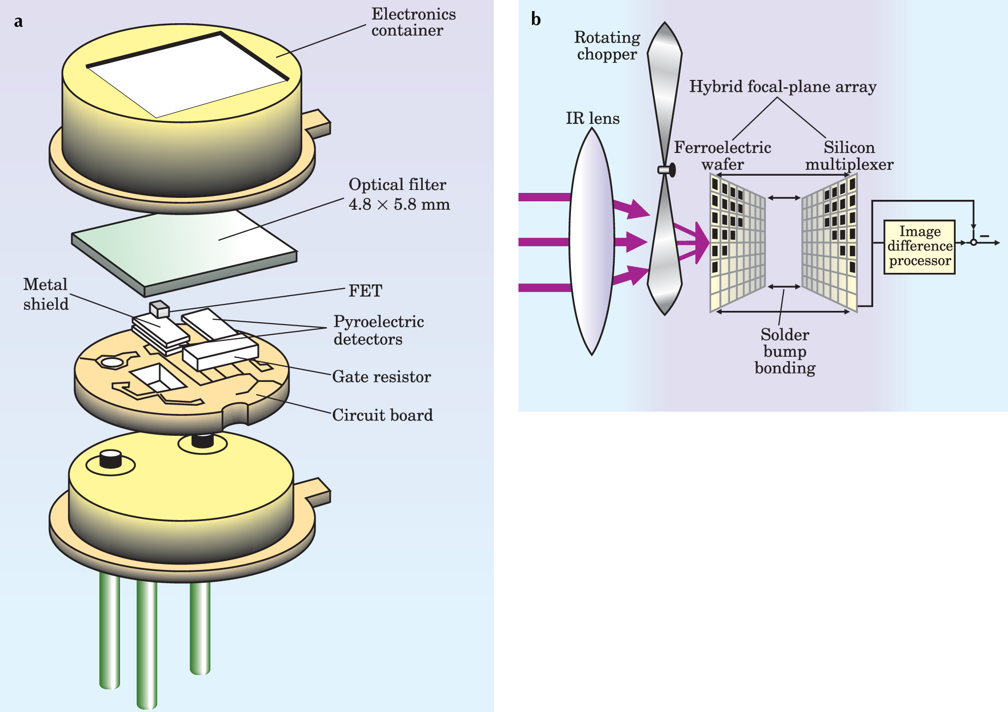 Figure 3. Single- and multiple-element pyroelectric detectors. (a) In this single-element configuration intended to monitor radiation with a wavelength near 10 microns, two lead titanate pyroelectric elements are used. One detector element is exposed to incoming radiation, another shielded under a metal strip. Both crystals are electrically connected with opposite polarities, to cancel out the effect of any drift in ambient temperature. (b) A ferroelectric-hybrid focal-plane device comprises a lens, usually made of germanium to block visible light, and an array of individual ferroelectric elements that are each bonded by tiny balls of solder to elements from a silicon multiplexer. The incident IR radiation must be periodically blocked, here by a chopper, to ensure that a temperature variation is measured.