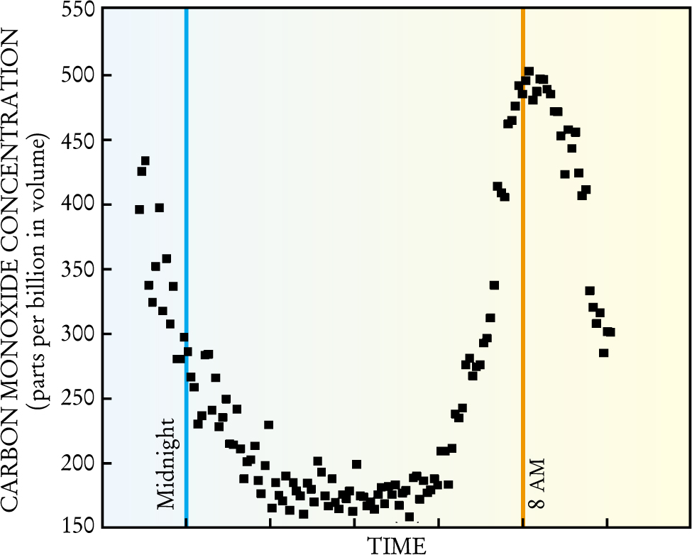 Carbon Monoxide Concentrations in ambient air, monitored with a gas sensor based on a thermoelectrically cooled quantum cascade laser. Provided by Physical Sciences Inc and Lucent Technologies, the laser operated in pulsed mode, emitting a wavelength of 4.6 μm in the distributed feedback configuration. Two characteristic maxima of CO concentration were observed over the course of a typical day in Houston, Texas. They are due to conditions prevailing during the morning and evening rush hours. Visible on the plot is most of the peak associated with the morning rush. The trailing portion of the evening-rush peak, though not the peak itself, is also evident. The measurements were performed at Rice University on 8 March 2001.