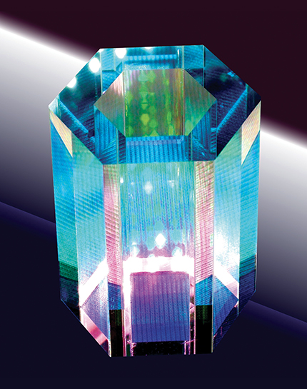 This hexagonal vacuum cell was used for quantum gate experiments in a 49-site, two-dimensional array at the University of Wisconsin–Madison. The cell was fabricated by ColdQuanta Inc out of antireflection-coated pieces of glass. The all-glass construction provides access for numerous laser beams to cool and trap atoms and to control an array of qubits.
