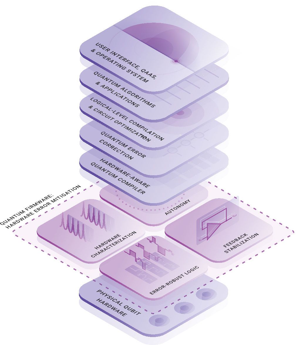 The stack in a fault-tolerant quantum computer is made of layers that correspond to levels of software abstraction. At the top sits Quantum As A Service (QAAS), which represents functions a user might interact with through, for instance, a cloud service. Below that are quantum algorithms and applications that are coded using developer tools that permit high-level abstraction. The algorithms and applications are compiled on the third level to enact circuits on encoded blocks. In fault-tolerant computing, that enaction is performed on logical qubits encoded using quantum error correction (QEC), although realizing the QEC code and other associated tasks occupies a dedicated layer. Physical connectivity between devices and compensation for any stray couplings are accounted for in a hardware-aware compiler. The quantum firmware layer, which is responsible for minimizing hardware error, resides between that layer and the physical hardware. It handles all tasks necessary for hardware calibration, tune-up, characterization, stabilization, and automation. (Image courtesy of Q-CTRL.)