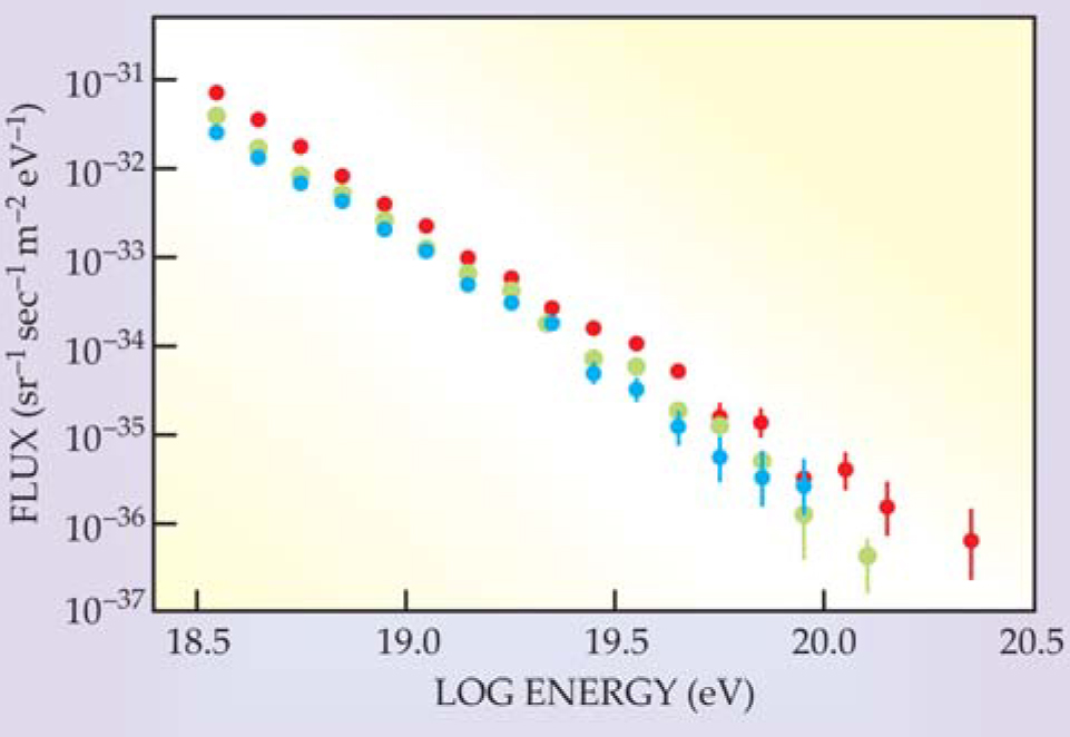 Figure 1. Extremely high-energy cosmic rays, according to conventional theory, should scatter from the cosmic microwave background. Thus, the spectrum should be suppressed at energies above about 3 × 1019 eV. The AGASA experiment (red) did not see any suppression, but the HiRes collaboration (green) did. In time, an experiment currently being run at the Pierre Auger Observatory should resolve the conflict. The plot also shows preliminary data (blue) from Auger.