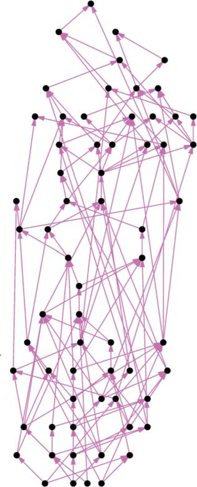 Figure 3. In causal set models, a discrete spacetime is characterized entirely in terms of causal relations. In this example, purple directed lines connect events (black dots) that are causally related; the arrow indicates the caused event. Points that are not connected are causally separated and are analogous to spacelike separated events in special relativity.