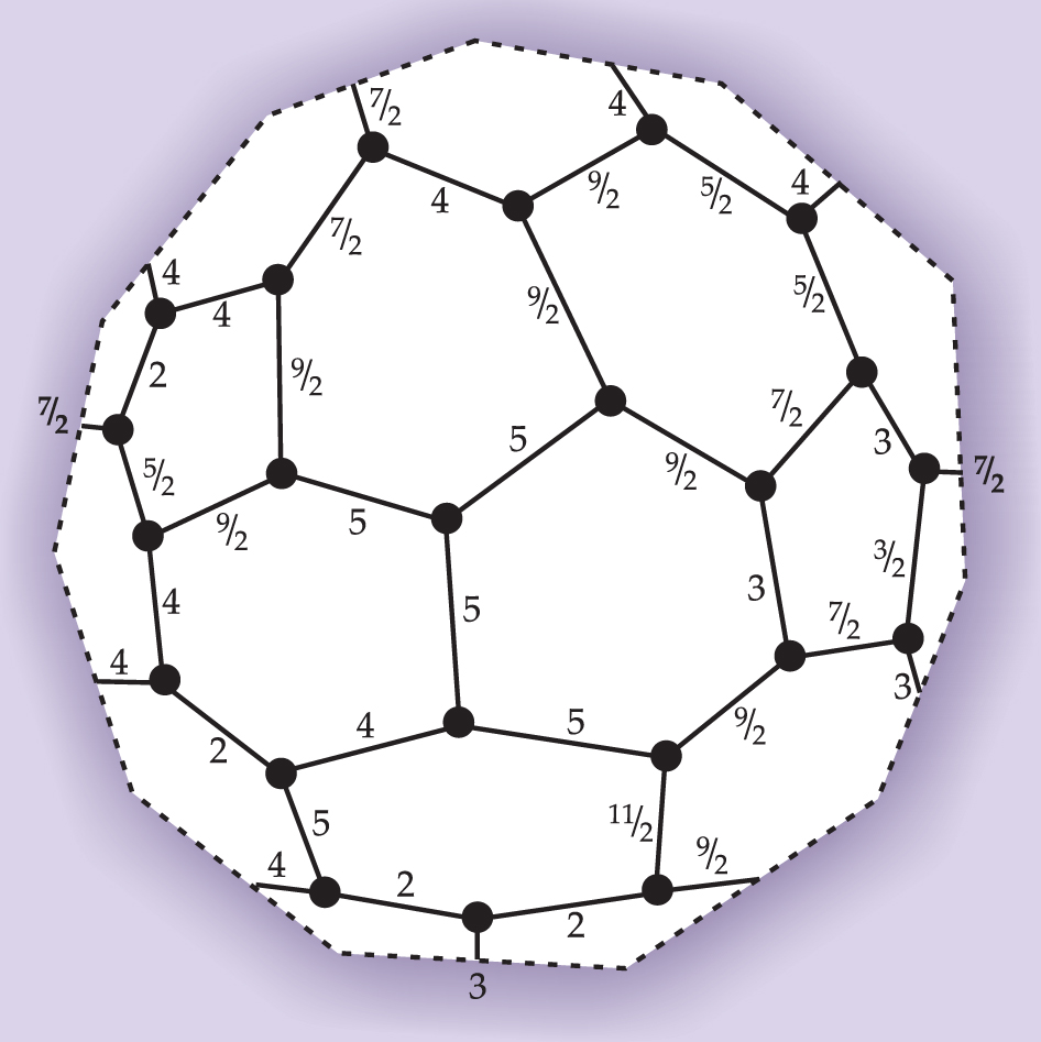 Figure 4. A loop-quantum-gravity state may be represented as a graphical network whose edges are labeled with units of quantized electric flux. A specific geometry would be an appropriate superposition of such states, just as a given state in nonrelativistic quantum mechanics is a superposition of energy eigenstates.