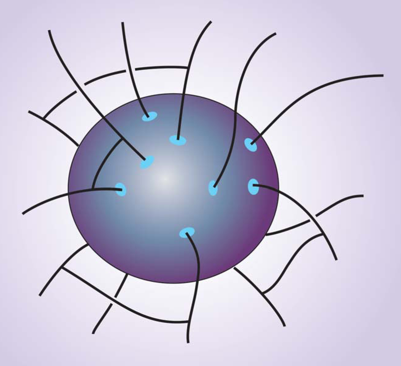 Figure 5. A black hole, in loop quantum gravity, is embedded in a spin network akin to, but more complicated than, the one shown in figure 4. LQG envisions the black-hole horizon as a two-dimensional surface made from discrete elements (not shown here). The black lines represent edges in the spin network, and the light blue disks on the surface indicate where the edges terminate at the horizon.
