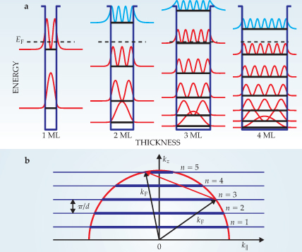 Figure 1. (a) This set of finite quantum wells represents the confinement of electrons in ultrathin metallic films whose thicknesses vary from one to four monolayers (ML). The squares of the electron wavefunctions in each quantum level are plotted on top of the corresponding occupied (red) and unoccupied (blue) states; the dashed lines for each film mark the Fermi level E F. As the principal quantum number n increases in each well, so does the fraction of an electron’s wavefunction that leaks out past the boundaries. (b) In a metal, electrons occupy nearly continuously distributed states inside the Fermi surface, often represented as the surface of a sphere of radius k F. In an ultrathin metal film of thickness d, quantization of the wave vector normal to the film’s surface, kz , divides the Fermi sphere into a discrete collection of two-dimensional disks or subbands—pictured here in cross section—each separated by Δkz = π/d for the ideal case of an infinitely deep well. As the film thickness increases from a single monolayer, additional subbands defined by n fall below E F. The effect is a periodic modulation of the electron concentration, scattering rate, and other electronic properties because new quantum states become available. The diagram pictures the scattering of an electron from subband n = 3 into n = 5 in a three-monolayer-thick film.