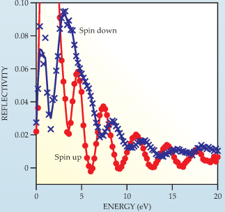 Figure 4. Quantum size effects in magnetic systems. The reflectivity of slow electrons from six-monolayer-thick iron microcrystals on a tungsten surface depends on whether the electrons are spin up (red) or spin down (blue). The exchange interaction accounts for the difference in reflectivity at any particular energy. The reflectivity oscillations of spin-down electrons have smaller amplitudes and larger damping than those of spin-up electrons because spin-down electrons have a shorter inelastic mean free path.