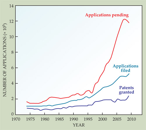Figure 3. The backlog of patent applications awaiting examination by the patent office has risen sharply over the past 15 years. The average interval is now about 36 months between the time of filing and the time a patent is granted. The patent office hopes the Leahy–Smith Act, which gives the office greater control over its own finances, will aid in addressing the backlog.
