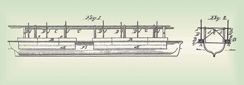 Figure 4. Abraham Lincoln, inspired by a mishap in which he found himself stranded on a sandbar, became the only US president to be granted a patent. Illustrated by the two figures shown here, the text of US Patent 6,469 begins: “Be it known that I, Abraham Lincoln, of Springfield, in the County of Sangamon, in the State of Illinois, have invented a new and improved manner of combining adjustable buoyant air chambers with a steamboat or other vessel for the purpose of enabling their draught of water to be readily lessened to enable them to pass over bars, or through shallow water, without discharging their cargoes.”