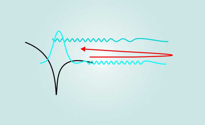 Figure 1. The basics of recollision. In the first step, an intense pulse of coherent IR light skews the potential well (black) of an atom or molecule’s electron. That allows the bound-state electron wavefunction (blue, sketched as a Gaussian) to tunnel and split, creating a wavepacket in the continuum. There, the wavepacket is driven by the oscillating laser field in a semiclassical trajectory (red): It first accelerates away from the atom and then, upon reversal of the field, accelerates back toward its origin, recolliding with its parent ion. The process is conceptually similar to an optical interferometer. The relative wavelengths of the tunneling wavepacket and bound-state wavefunction are illustrated approximately to scale.