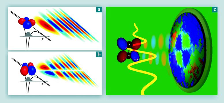 However, in a low-density gas even more information is available. It follows from equation 1 that the bound-state orbital leaves a deep imprint on the tunneling-electron wavepacket, not only through the angle dependence of the ionization probability but also through the angle dependence of the wavepacket structure. That imprint is illustrated in figure 2, panels a and b, which contrast wavepackets generated for two different orientations of the light polarization relative to the axis of an oxygen molecule. A two- or three-dimensional imaging detector like that illustrated in figure 2c can directly measure the transverse component of the electron wavepacket. As long as the electron does not recollide, nothing stands between it and the detector.