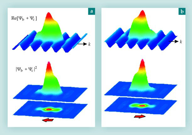 Figure 3. Generation of high harmonics via recollision. (a) The total wavefunction (top row), the total probability (middle row), and the two-dimensional projection of the probability function (bottom row) illustrate the dipole induced by the superposition of the approximately Gaussian bound-state wavefunction Ψb with the approximately sinusoidal recollision wavepacket Ψc. The red arrow indicates the orientation of the dipole. (b) The same superposition shown an instant later, after the recollision wavepacket has moved by half a cycle in the k direction, illustrates the dipole oscillation.