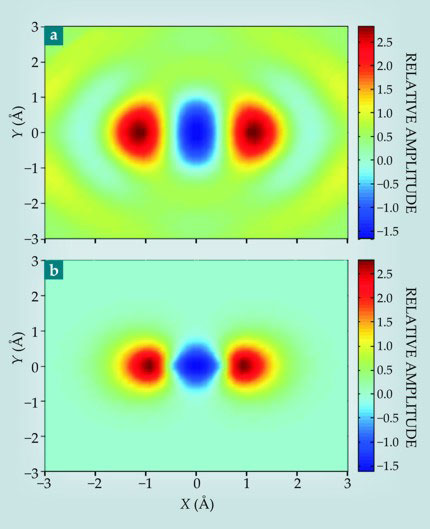 Figure 4. Recollision tomography.(a) The image of the highest occupied molecular orbital in a nitrogen molecule shown here was derived from a recollision experiment. The color indicates the relative amplitude. (b) The orbital image attained via the Hartree–Fock calculation is qualitatively similar. (Adapted from ref. 10.)