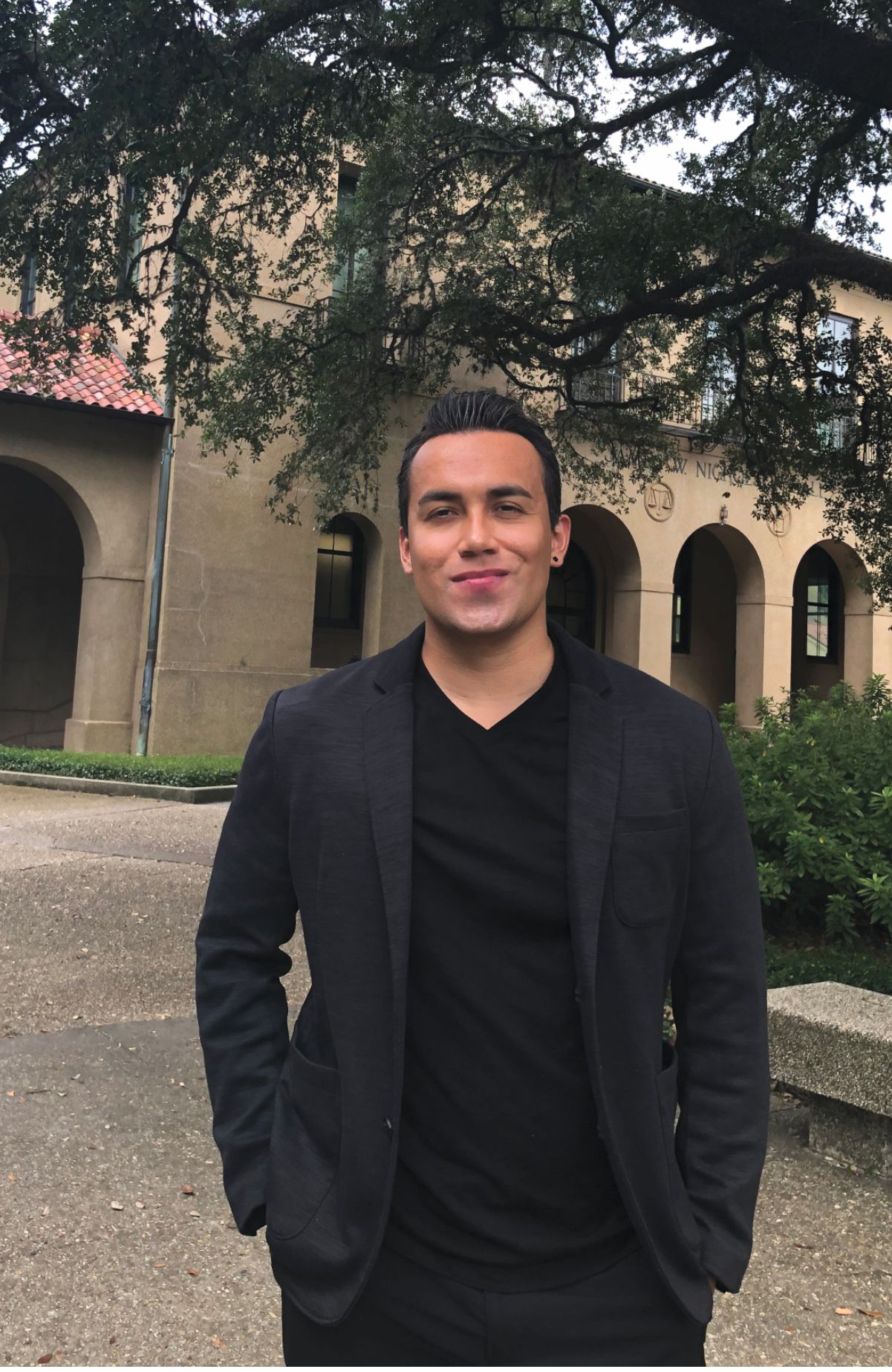 The author, in his interview clothes, stands outside Louisiana State University’s quantum photonics laboratory. He now leads the lab as a faculty member in the physics department.