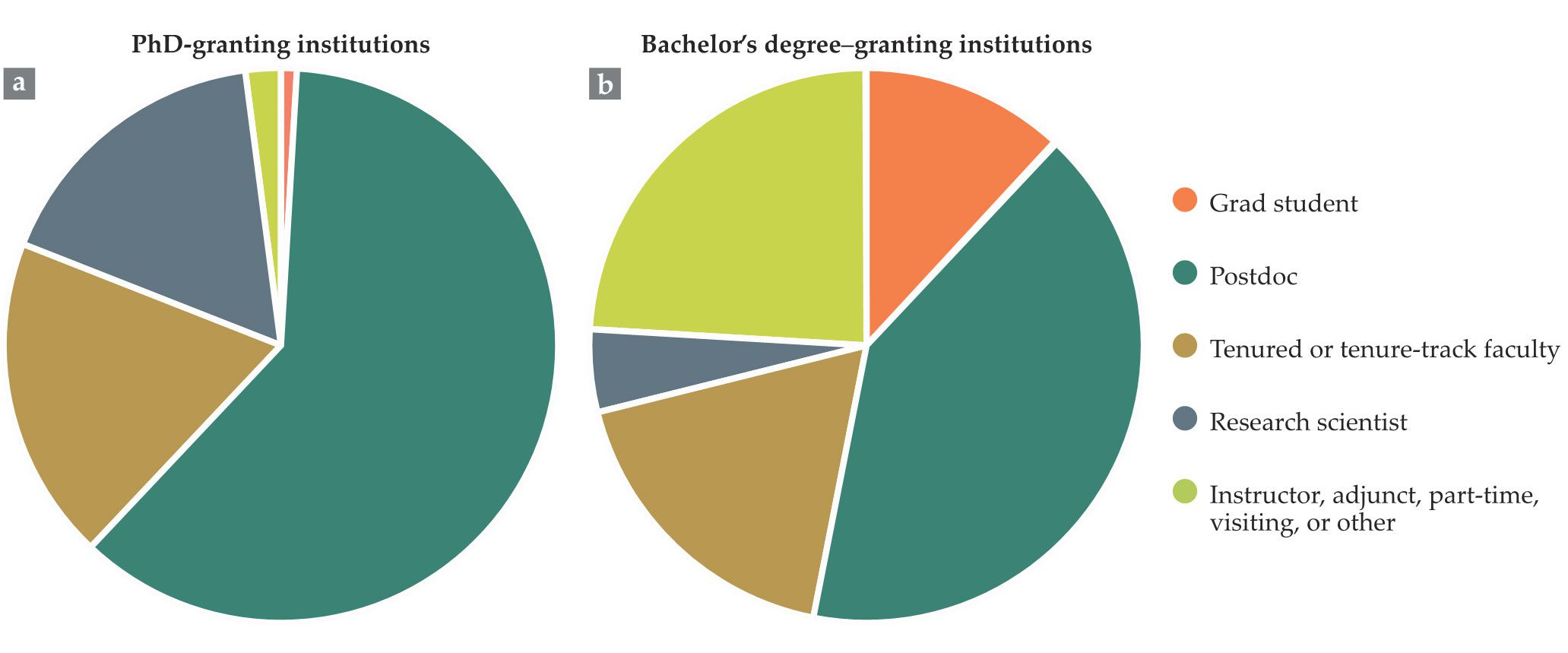 New tenured or tenure-track physics faculty at PhD-granting institutions (a) in the 2017–18 academic year were most likely to come directly from a postdoc position. Career trajectories are more varied for faculty at bachelor’s degree–granting institutions (b), but postdoc was still the most common previous position for new hires. (Adapted from ref.