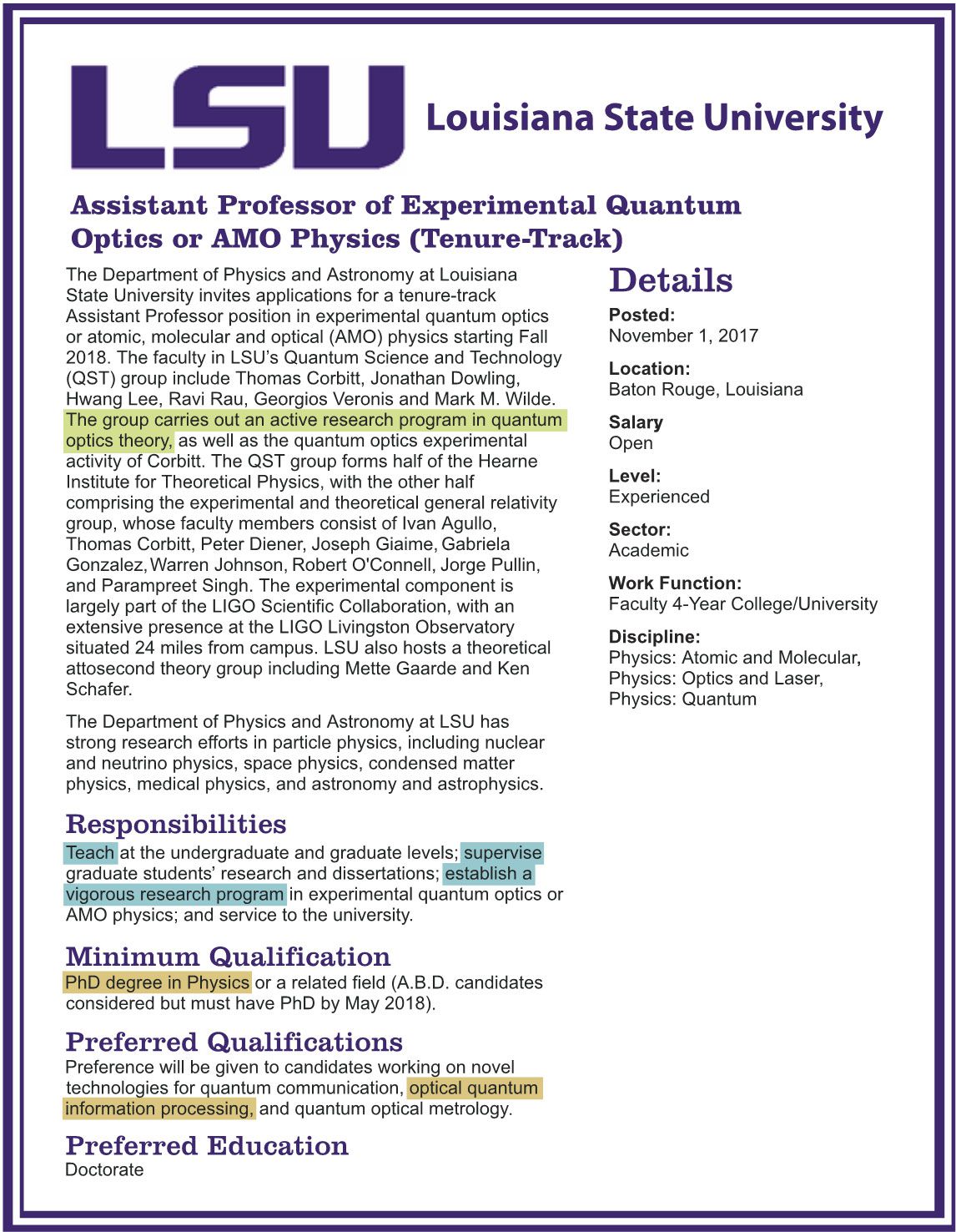 The job posting for a faculty position should guide your application. The qualifications for my current position at Louisiana State University, highlighted in brown, were reflected in my background. My application referenced the job’s responsibilities, highlighted in blue, and explained how I would be able to carry them out. Being aware of the department’s focus on theoretical research, highlighted in green, helped me envision how my experimental background might complement the existing program. (Adapted from the Physics Today Jobs posting.)