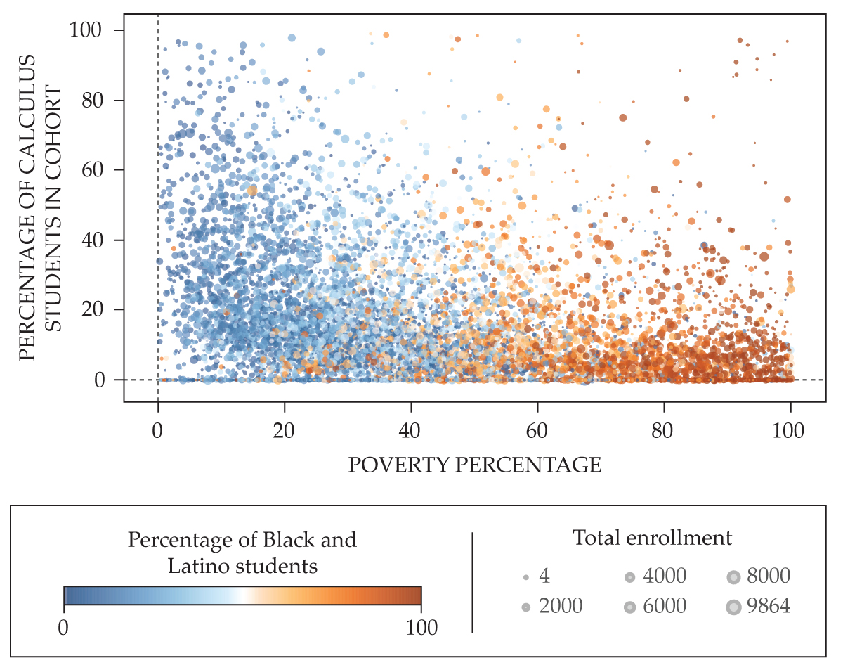 The percentages of high school students who enroll in calculus classes in US school districts depend in part on the poverty percentage in those districts. The size of the dots reflects the number of students enrolled in a school district, and colors represent the percentage of Black and Latino students. (Figure courtesy of Michael Marder, data from ref. 3.)
